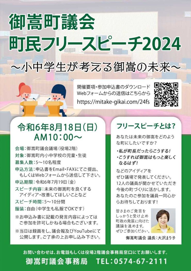 令和6年8月18日(日)、御嵩町議会議場にて小中学生を対象にした町民フリースピーチを開催いたします。
